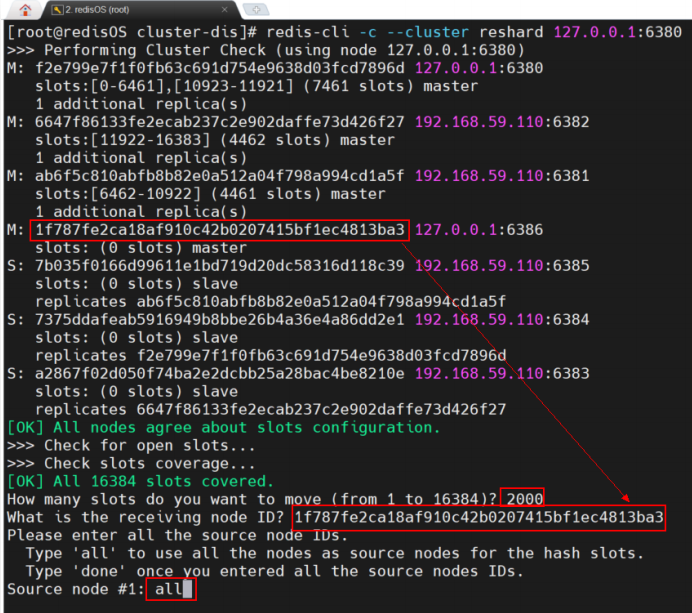 - 要删除的节点所包含的slot数量在前面检测结果中都是可以看到的,例如,6386中的并不是2000个,而是1999个;