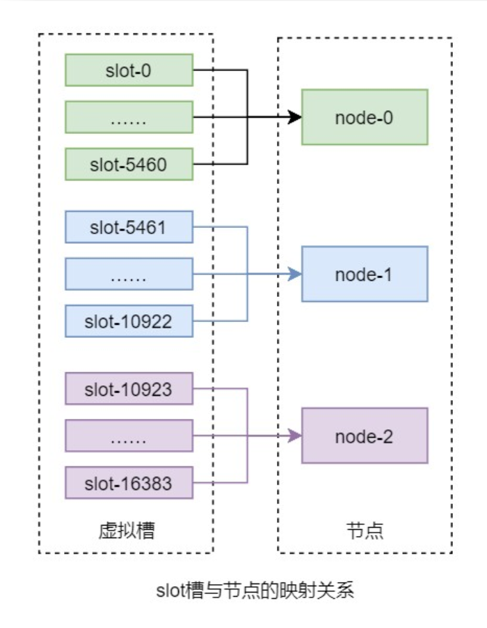 该算法首先虚拟出一个固定数量的整数集合,该集合中的每个整数称为一个 slot 槽。这个槽的数量一般是远远大于节点数量的。然后再将所有 slot 槽平均映射到各个节点之上。例如,Redis 分布式系统中共虚拟了 16384 个 slot 槽,其范围为[0, 16383]。假设共有 3 个节点,那么 slot 槽与节点间的映射关系如下图所示: