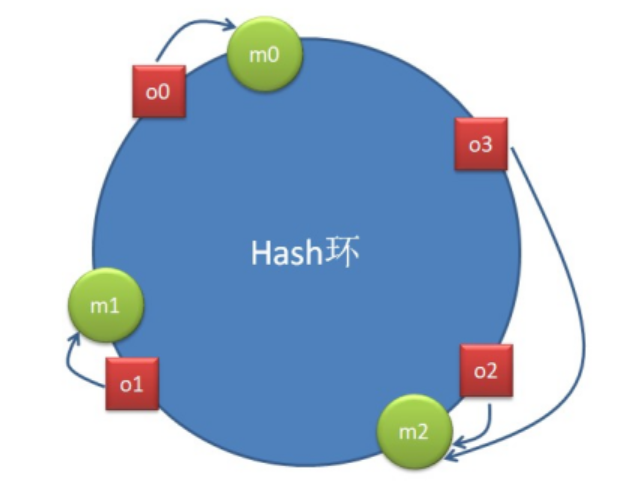 上图中存在四个对象 o0、o1、o2、o3,分别代表四个待分配的数据,红色方块是这四个数据的 hash(o)在 Hash 环中的落点。同时,图上还存在三个节点 m0、m1、m2,绿色圆圈是这三节点的 hash(m)在 Hash 环中的落点。