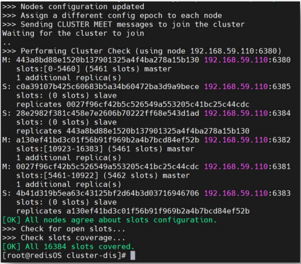 6 个节点启动后,它们仍是 6 个独立的 Redis,通过 redis-cli --cluster create 命令可将 6 个节点创建了一个分布式系统。