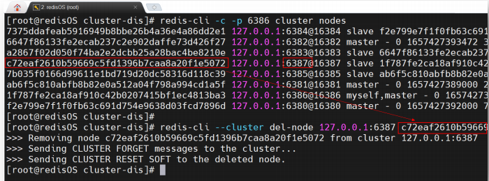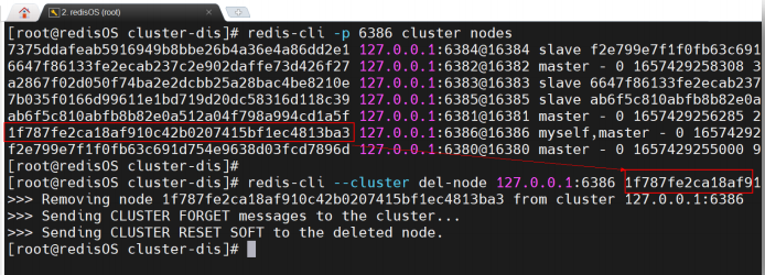 redis-cli --cluster del-node <delHost>:<delPort> delNodeID