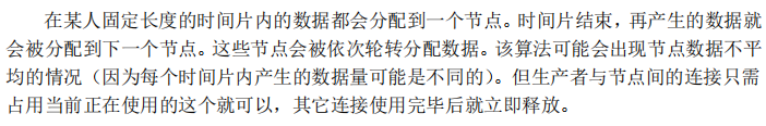 每产生一个数据,就要依次分配到不同的节点。该算法适合于数据问题不确定的场景。其分配的结果是,在数据总量非常庞大的情况下,每个节点中数据是很平均的。但生产者与数据节点间的连接要长时间保持。