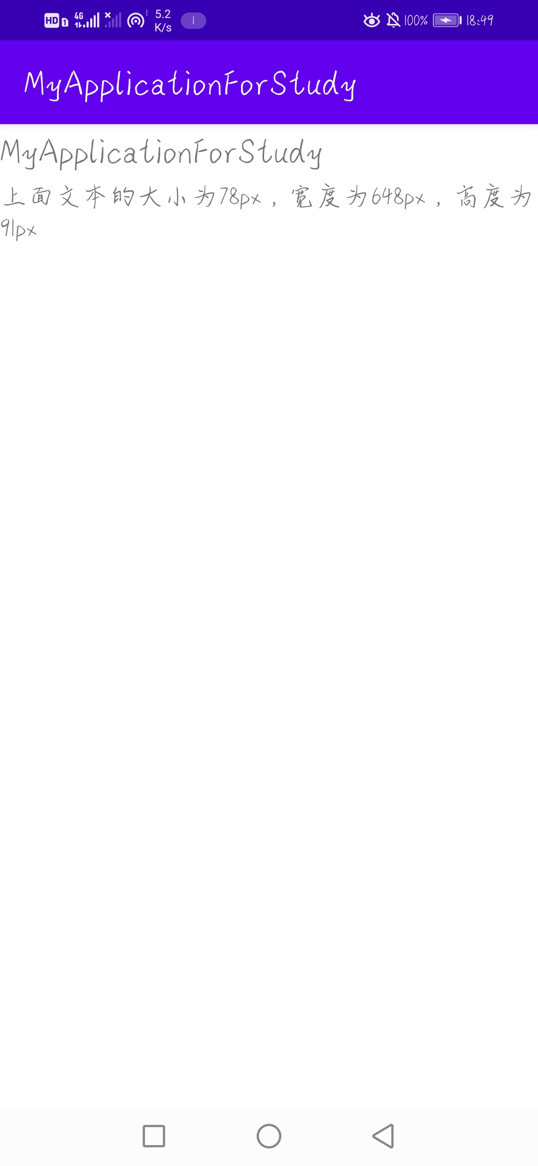 public class MeasureTextActivity extends AppCompatActivity {@Overrideprotected void onCreate(Bundle savedInstanceState) {super.onCreate(savedInstanceState);setContentView(R.layout.activity_measure_text);TextView textView_1, textView_2;textView_1 = findViewById(R.id.textView_1);textView_2 = findViewById(R.id.textView_2);float width = getWidth(textView_1.getText().toString(), textView_1.getTextSize());float height = getHeight(textView_1.getText().toString(), textView_1.getTextSize());String string = String.format("上面文本的大小为%.0fpx,宽度为%.0fpx,高度为%.0fpx", textView_1.getTextSize(), width, height);textView_2.setText(string);}public float getWidth(String text, float textSize) {if (TextUtils.isEmpty(text)) {return 0;}Paint paint = new Paint();paint.setTextSize(textSize);return paint.measureText(text);}public float getHeight(String text, float textSize) {if (TextUtils.isEmpty(text)) {return 0;}Paint paint = new Paint();paint.setTextSize(textSize);paint.measureText(text);Paint.FontMetrics fontMetrics = paint.getFontMetrics();return fontMetrics.descent - fontMetrics.ascent;//返回值单位为px}