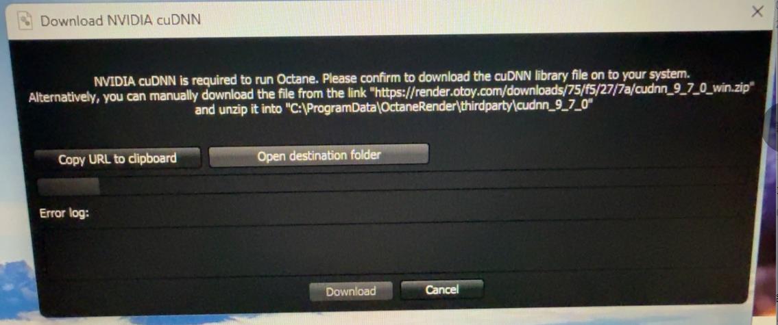 C4D R23 Octane 错误弹窗Download NVIDIA cuDNN NVIDIA cuDNN is required to run Octane.Please confirm to download the cuDNN library file on to your system.