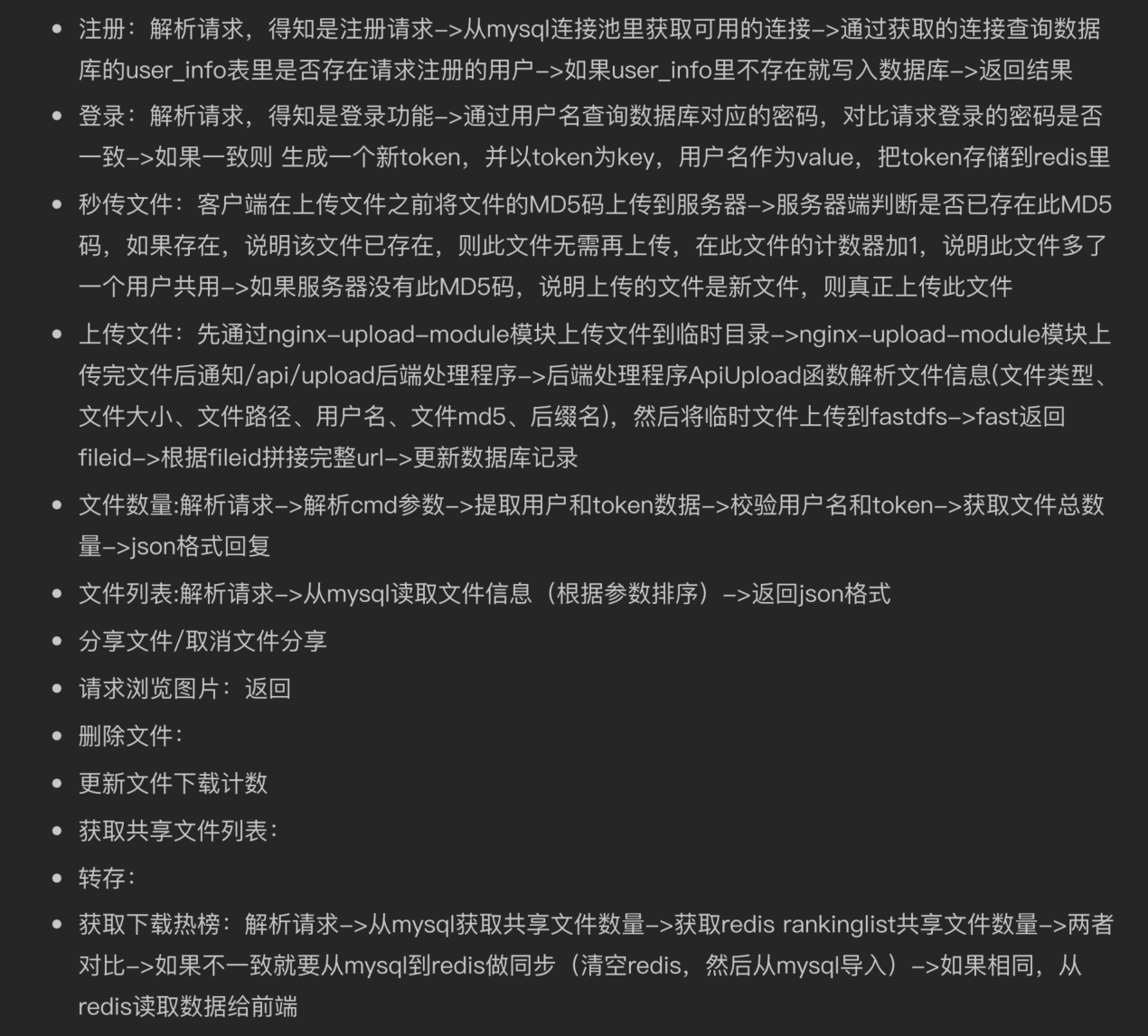 ①整体架构的设计:之前只做过⽹络编程的内容,想着真正做⼀个可以有功能的完整项⽬。这个项⽬能 够以⽹络编程,连接池,数据库的技术为基础,于是想到做⼀个可做到线上存储和共享的多⽤户系统。于是学习了nginx的如何使⽤,将其选择作为代理层,同时了解到fastdfs可以作为⽂件服务的站点,并且 有 fastdfs-nginx-module这个模块。于是以⽹络编程为基础,nginx和对应的fastdfs模块作为代理层,后端服务层做了具体的业务逻辑,mysql和redis作为存储层,设计了四层框架,每⼀层分配了具体的任务,最后完成了这样⼀个项⽬。