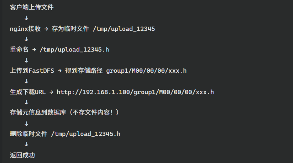 ⽂件⼤⼩、⽂件路径、⽤户名、⽂件md5、后缀名),然后将临时⽂件上传到fastdfs->fast返回