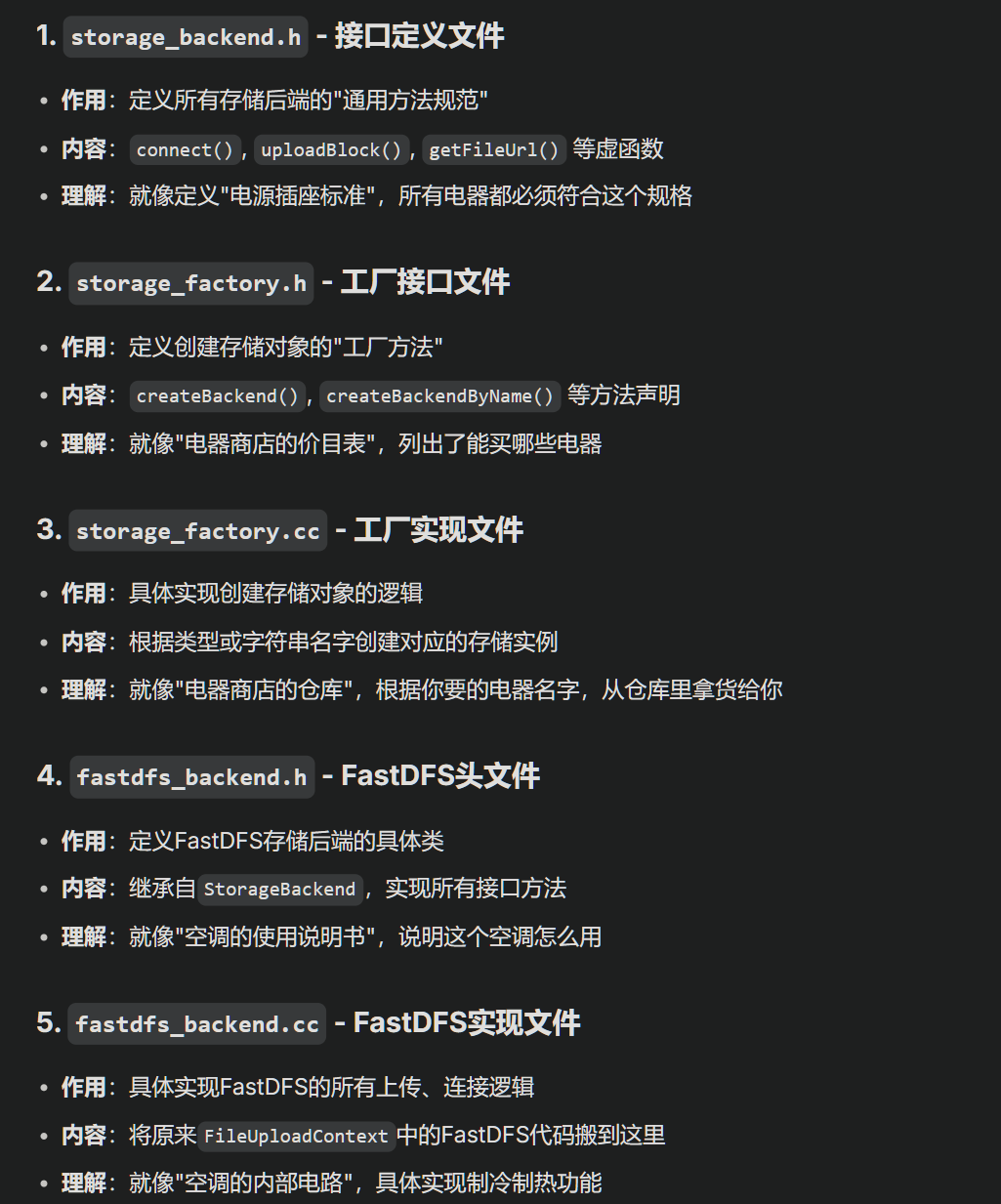 用户代码 → storage_factory → storage_backend ← fastdfs_backend/minio_backend/cos_backend(创建哪个后端) (统一接口) (具体实现)![]()