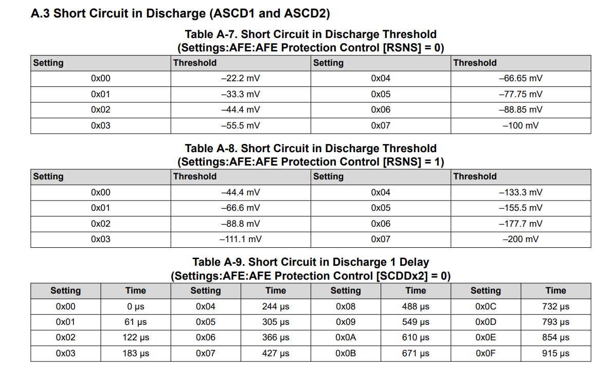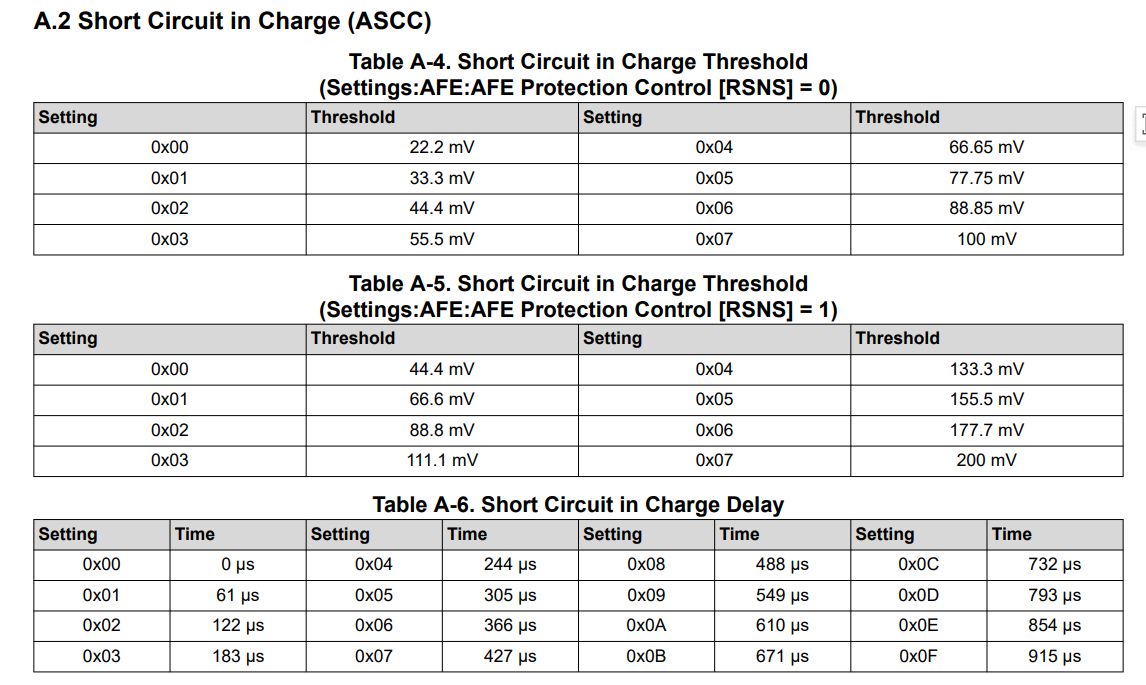 - OCC1和2分别是充电过流保护1nd和2nd,遵循1nd小电流,长时间触发。2nd大电流,短时间触发;OCC 则是恢复值,要填负值,也就是放电。比如触发了OCC1或者2,那么放点电恢复;OCD1和2同理,只不过是放电过流,OCD则是充电时恢复;不能出现OCC填正值(充电),因为充电过流保护后,充电MOS关闭了,这时候充不进去了,放电同理;