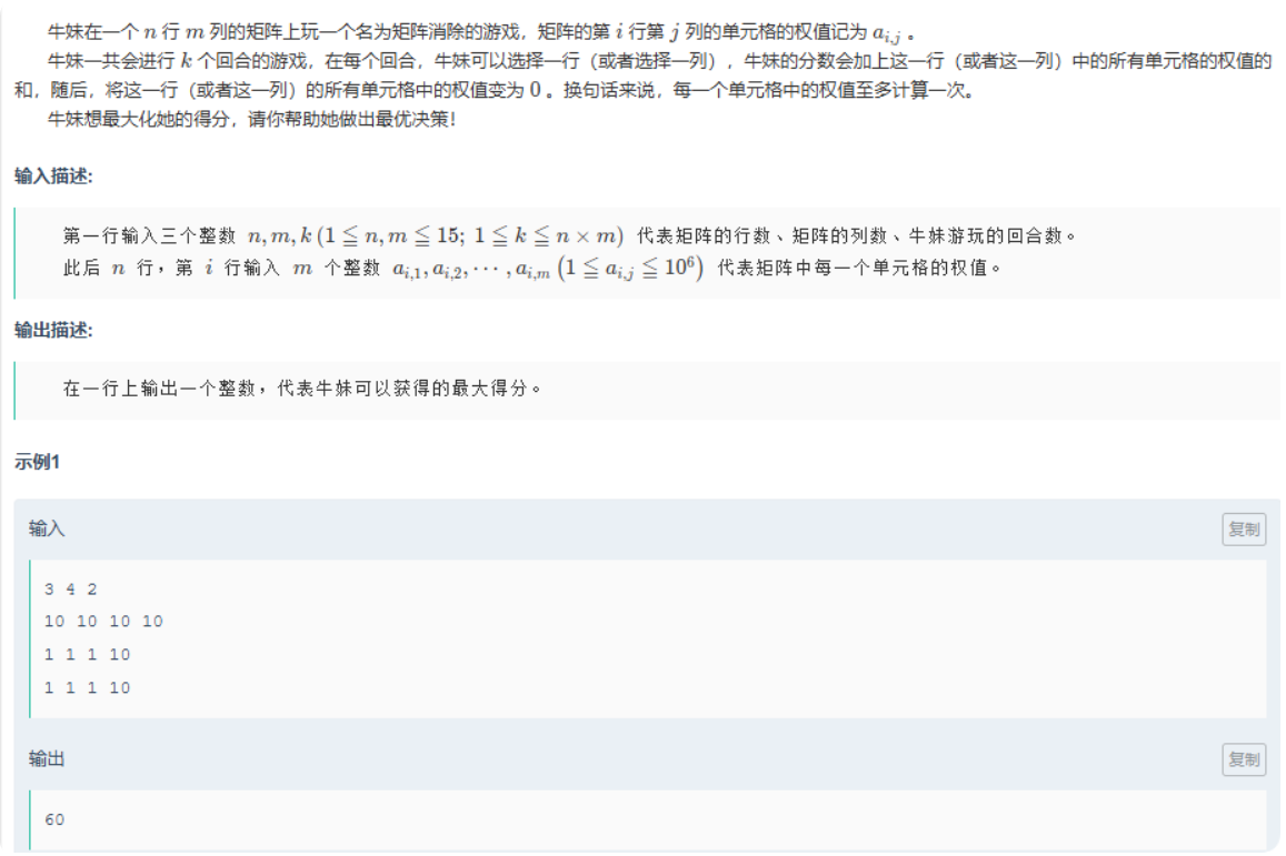 先选行再选列,例如:如果k=5,表示我们可以选择行列一共5次,我们可以枚举0到5行的所有选择方案,假如我们选择了3行,那么我们就把在剩下的列里面选择两个最大的,每选完5次就和之前的做比较,最后取最大的一次即可。