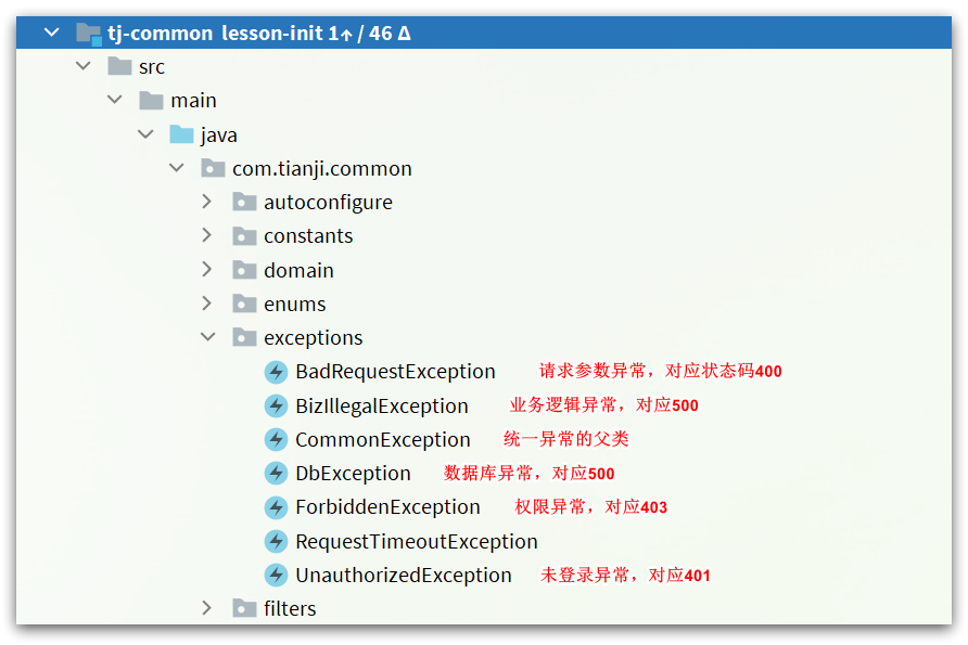 当微服务抛出这些异常时,需要一个统一的异常处理类,同样在tj-common
