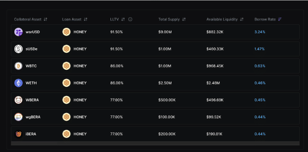 在 Borrow 端,我们可以通过 wsrUSD、wETH、wBTC、wBERA、sUSDe、wsrUSD、iBERA、wgBERA 等资产进行抵押,向池中借出 HONEY 资产用于进一步的收益。