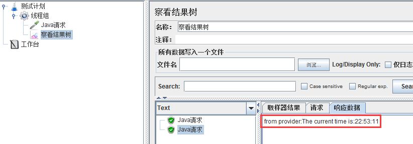 上图为两个线程测试了一下,发现调用通过成功,响应数据正常返回,故该脚本可以正常使用,至此jmeter测试dubbo接口整个的脚本制作过程就讲完了