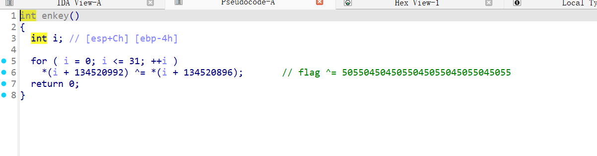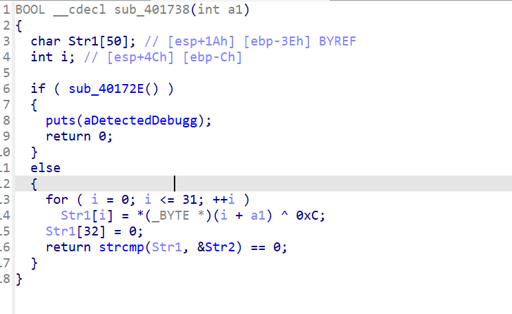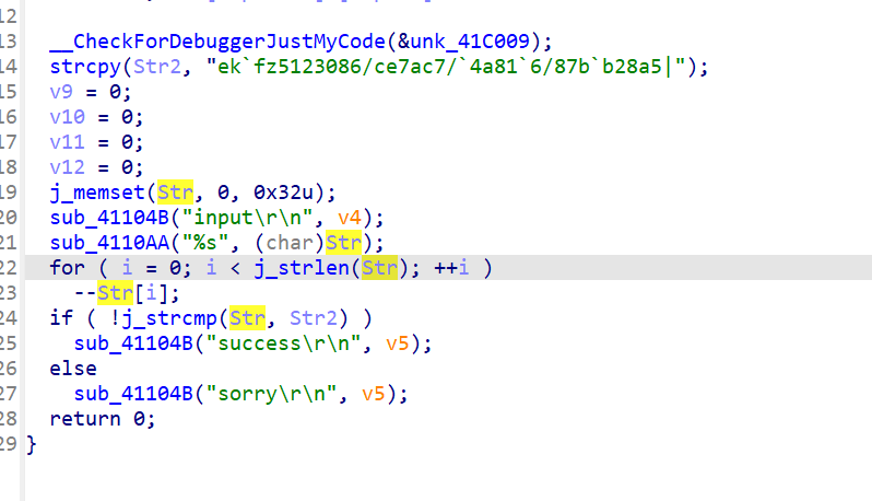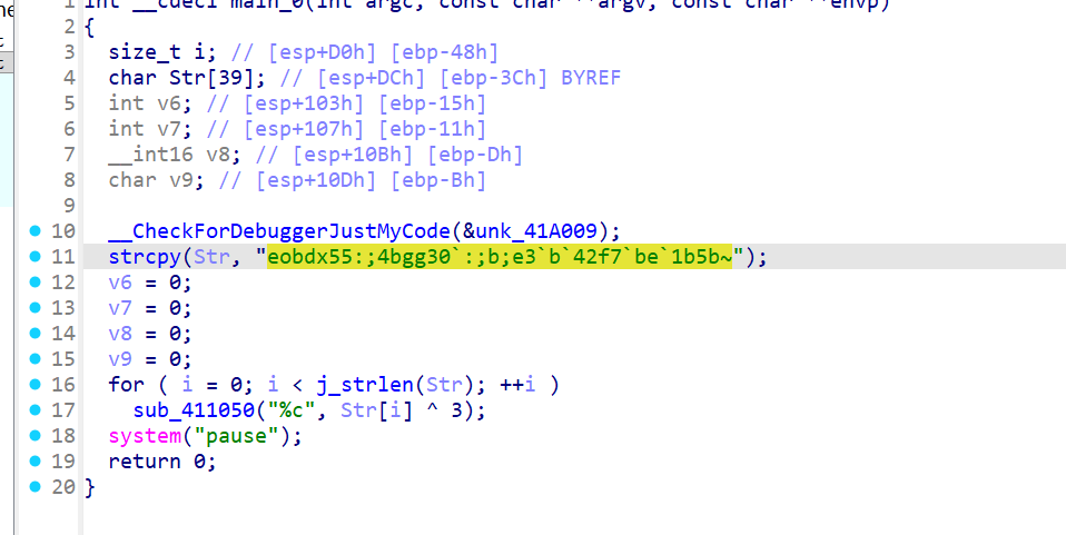 {char v4; // [esp+0h] [ebp-190h]size_t ii; // [esp+D0h] [ebp-C0h]size_t n; // [esp+DCh] [ebp-B4h]size_t m; // [esp+E8h] [ebp-A8h]size_t k; // [esp+F4h] [ebp-9Ch]size_t j; // [esp+100h] [ebp-90h]int v10; // [esp+10Ch] [ebp-84h]size_t i; // [esp+118h] [ebp-78h]char input[104]; // [esp+124h] [ebp-6Ch] BYREF__CheckForDebuggerJustMyCode(&word_41C00E);j_memset(input, 0, 0x64u);for ( i = 0; i < j_strlen(Str); ++i )Str[i] ^= 0xAu;puts(aLookAtH3r3S, (char)Str);scanf(aS, (char)input);v10 = 0;for ( j = 0; j < j_strlen(aNqt); ++j ){input[v10] ^= 0xBu;if ( aNqt[j] != input[v10] ){