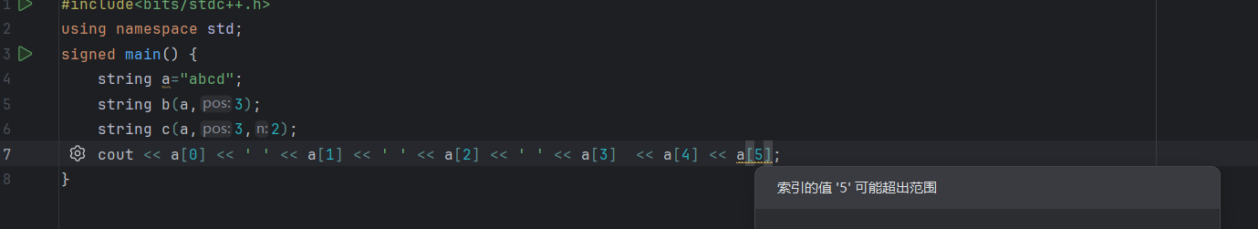 int main() {string a="abcd";string b(a,3);string c(a,3,2);cout << a[0] << ' ' << a[1] << ' ' << a[2] << ' ' << a[3] ;