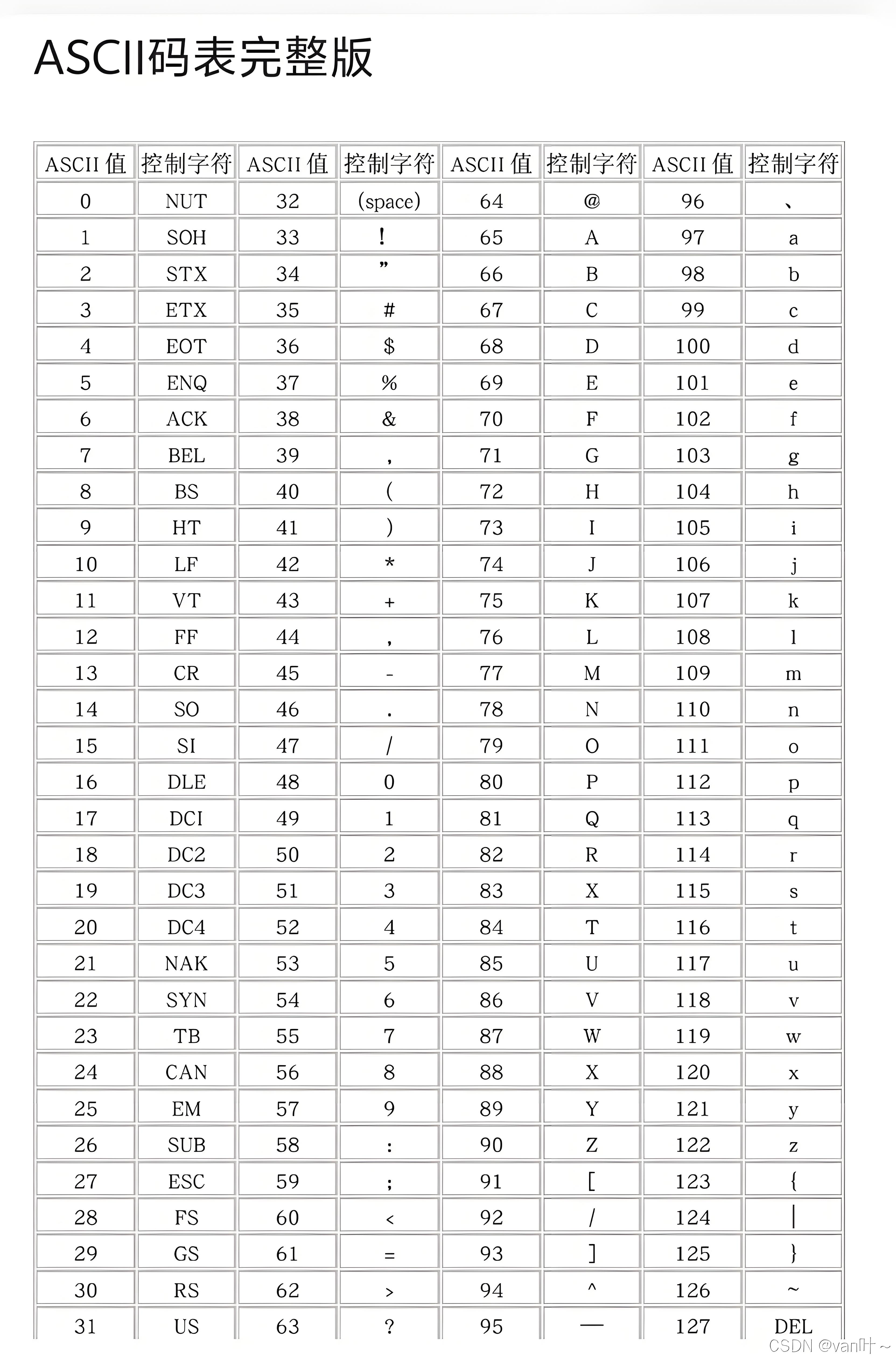 计算机只能识别二进制数字,无法直接存储 “字符”。因此,人们约定了一套规则:给每个常用字符分配一个唯一的十进制数字,这套规则就是ASCII 码表(American Standard Code for Information Interchange)。