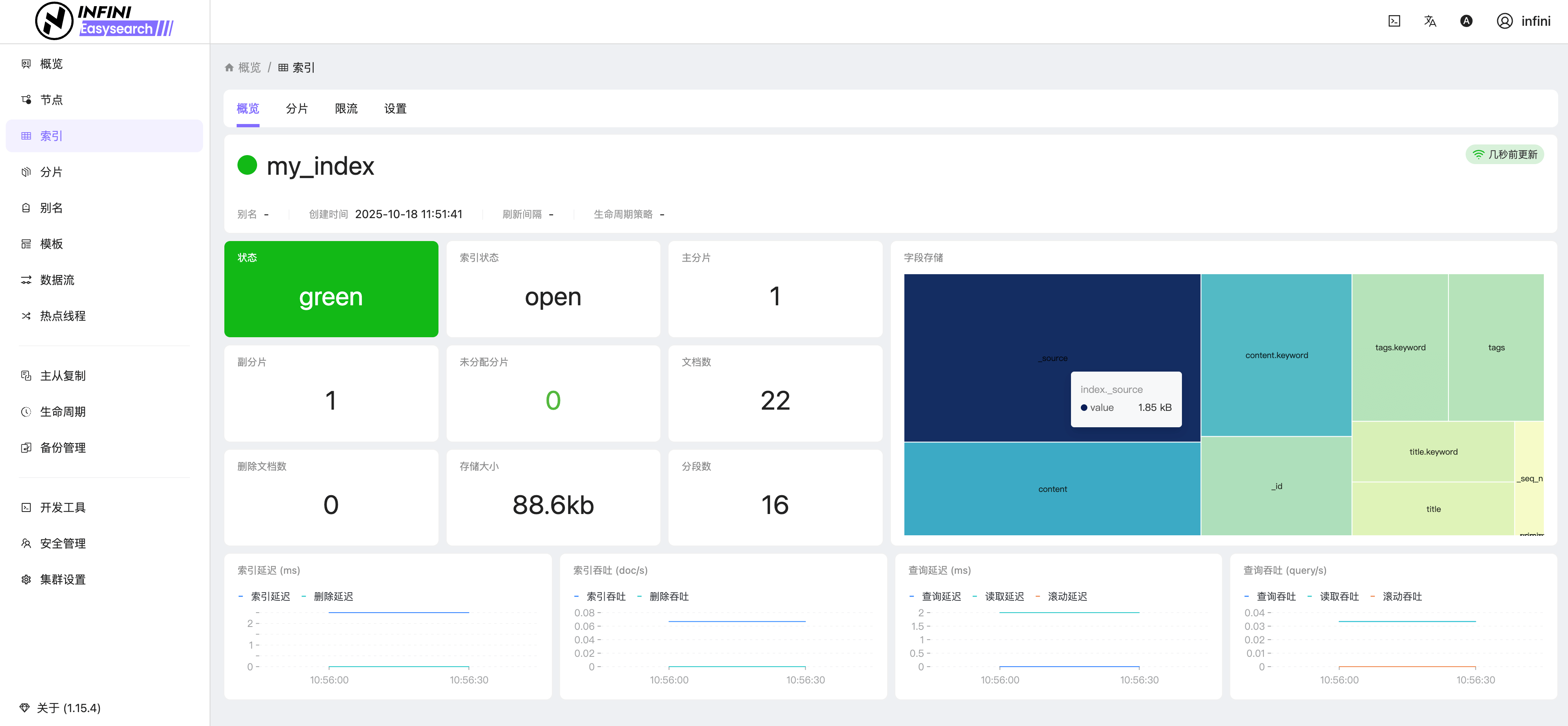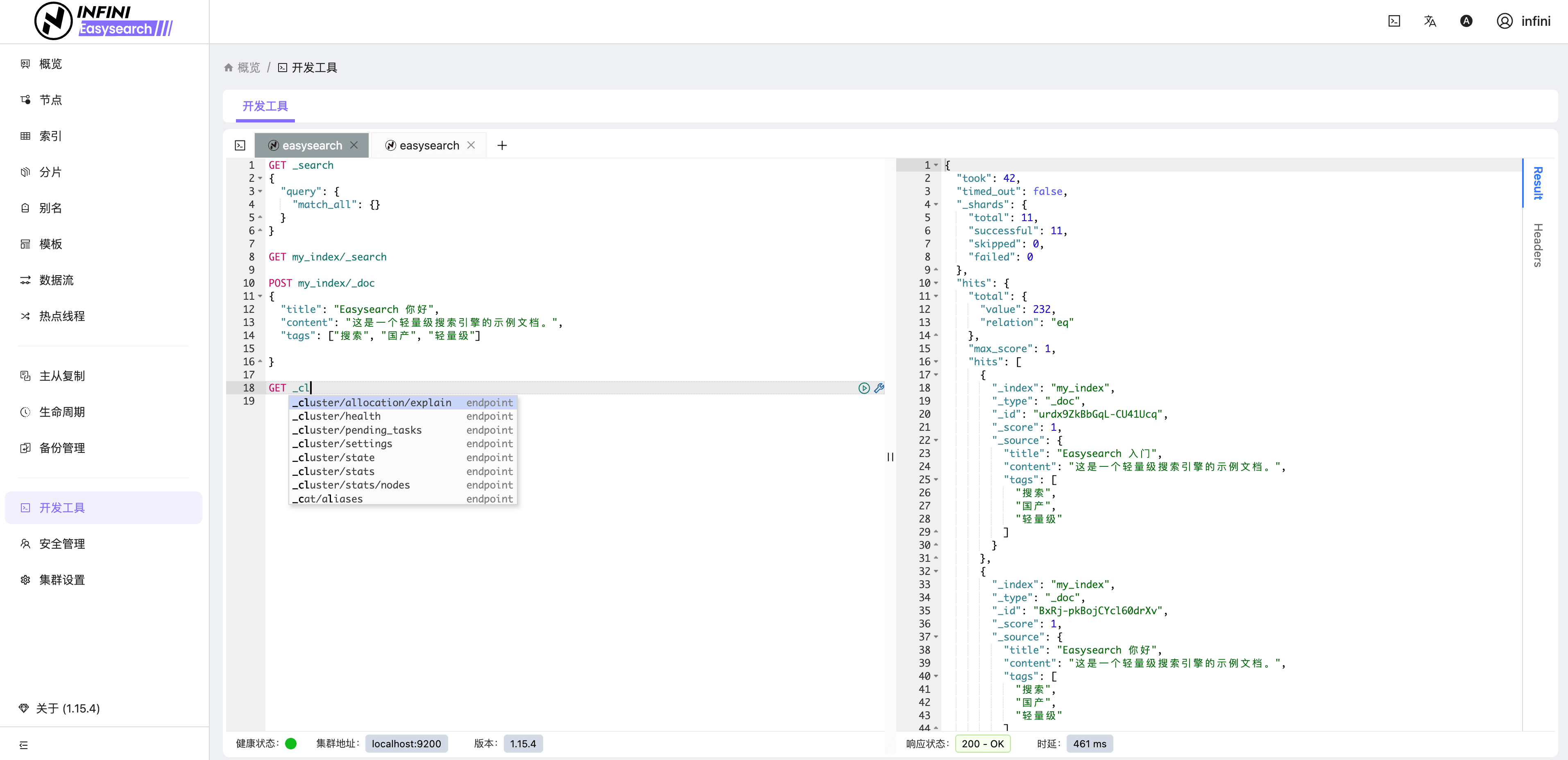 - 可视化运维:无需 Kibana 即可通过内置 Web UI 插件界面管理索引、节点与监控指标等。
