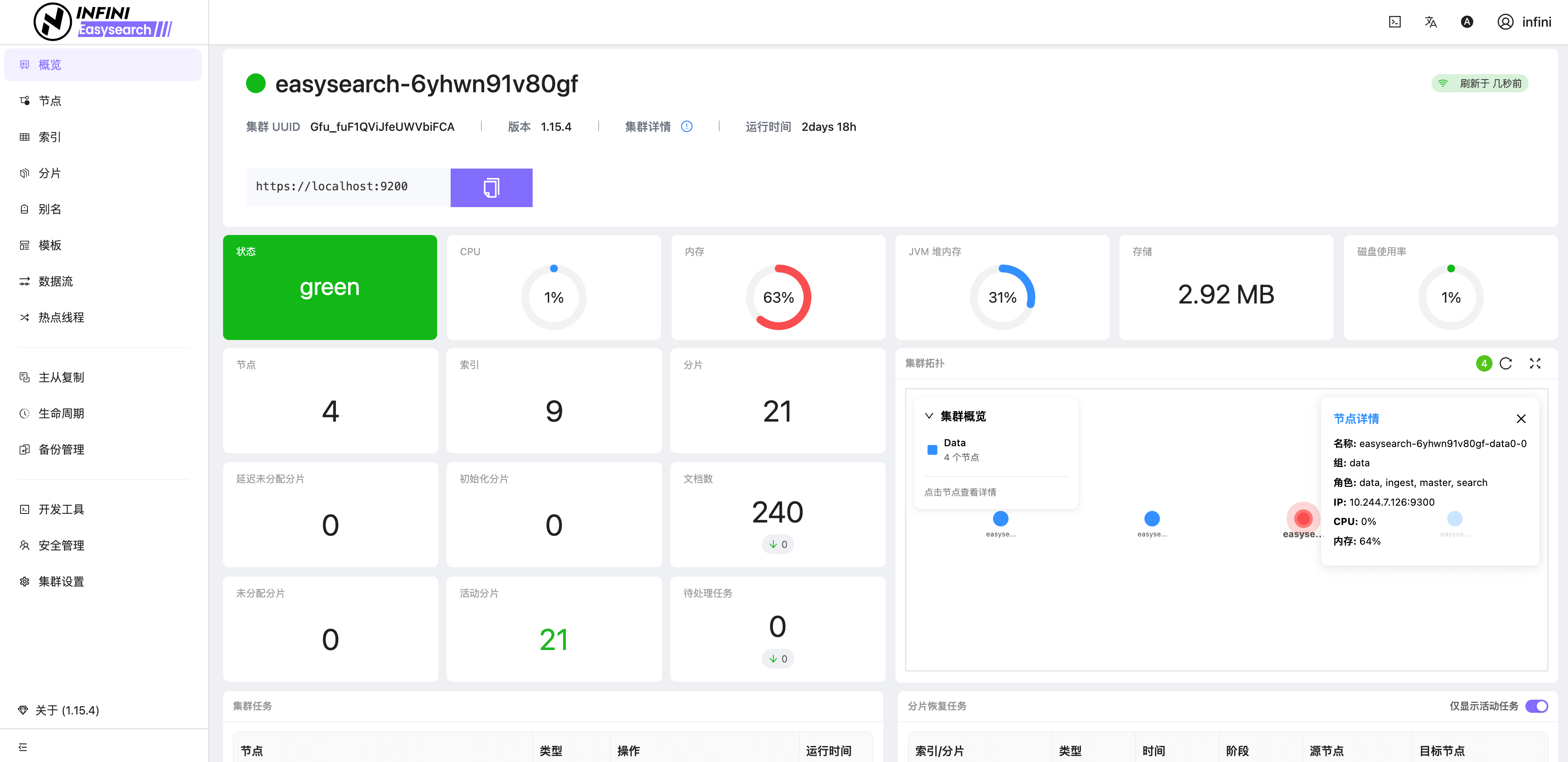 Easysearch 提供了轻量级界面化管理功能,不再依赖第三方组件即可对集群进行管理,真正做到开箱即用。如果你安装了 Easysearch UI 插件或者下载捆绑包,可通过 https://localhost:9200/_ui/ 访问,进行节点、索引、分片、查询调试和监控查看等管理。
