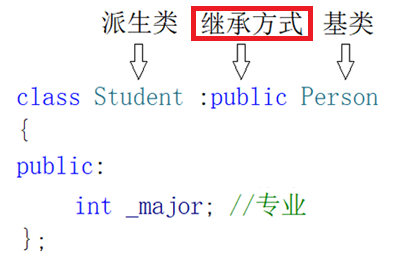 在子类(派生类)之后加一个 ' : ' 与继承方式,再跟上父类(基类)的类名。