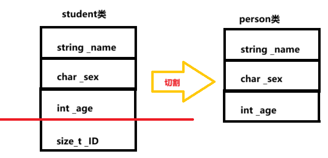 如果是public继承的派生类,那么它的对象可以赋值给基类的指针/基类的引用/基类对象。这⾥有个形象的说法叫切割:寓意把派⽣类中基类那部分切出来,基类指针或引⽤指向的是派⽣类中切出来的基类那部分。