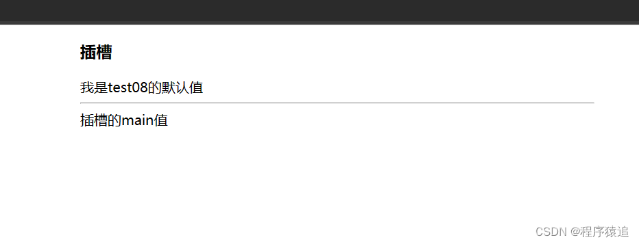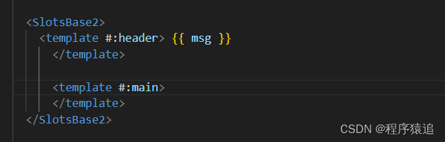 <SlotsBase2><template v-slot:header> </template><template v-slot:main></template></SlotsBase2>export default {data() {return {msg: "我是test08的默认值",// num: 10}},components: {SlotsBase2},name: "test08"
