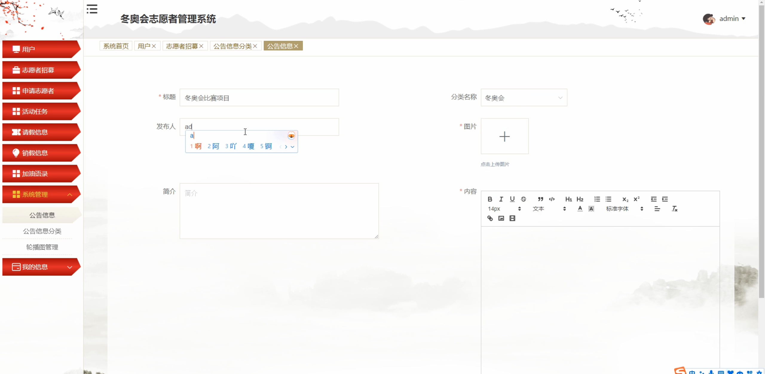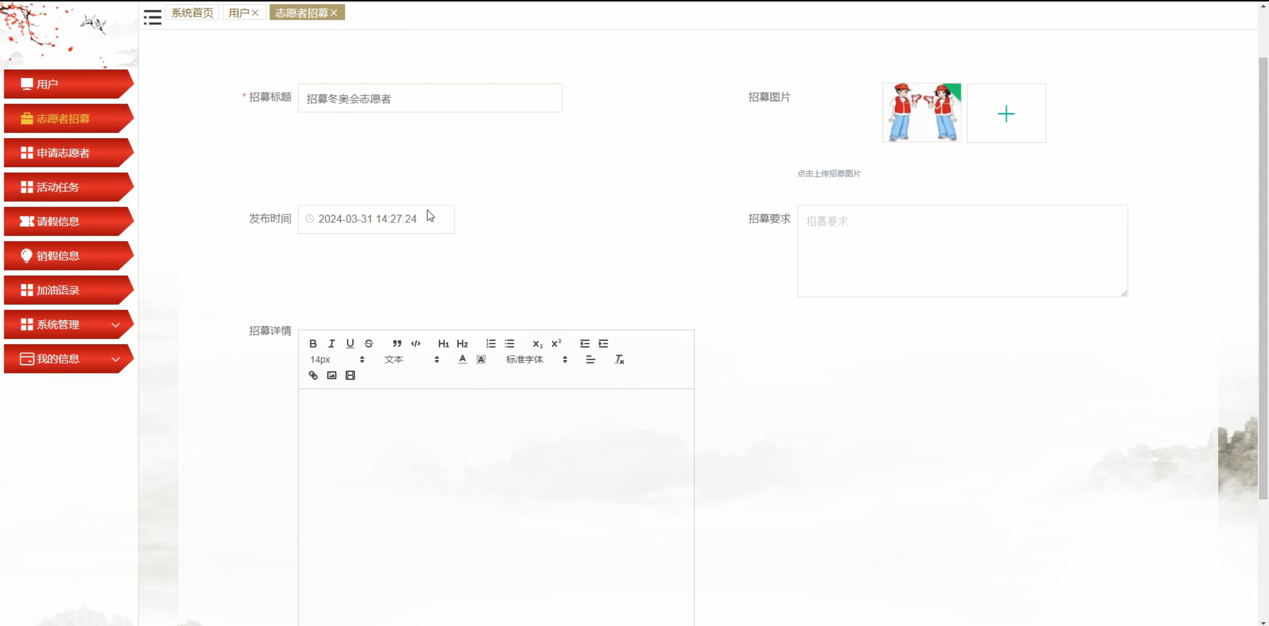 2025年第九届亚洲冬季运动会在哈尔滨成功举办,吸引了来自34个国家和地区的1275名运动员参与,赛事规模创历史新高。作为国际性冰雪盛会,亚冬会不仅需要高效的赛事组织,更依赖志愿者团队的协同服务。据赛事组委会统计,本届亚冬会共招募志愿者超5000人,涵盖语言翻译、赛事引导、医疗救助等20余类岗位。传统手工管理模式在志愿者调度、培训记录、服务时长统计等环节存在效率低下、信息滞后等问题,难以满足大型赛事的动态管理需求。