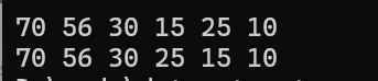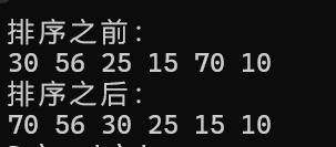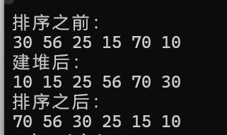 {int arr[6] = { 30,56,25,15,70,10 };printf("排序之前:\n");for (int i = 0; i < 6; i++){printf("%d ", arr[i]);}printf("\n");HeapSort01(arr, 6);printf("排序之后:\n");for (int i = 0; i < 6; i++){printf("%d ", arr[i]);}return 0;
