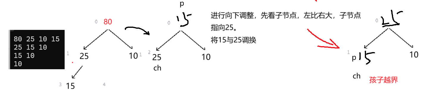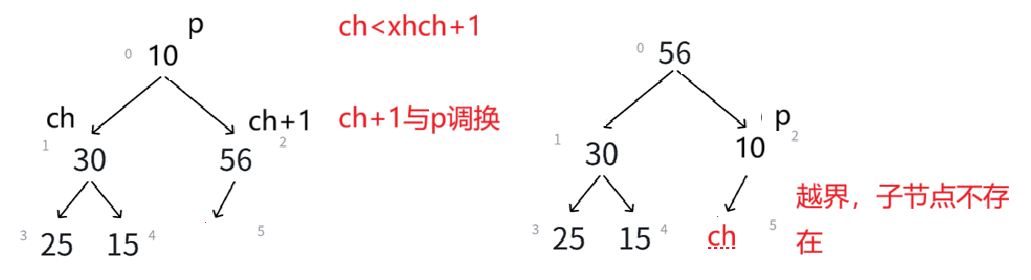 --算法思路:定义两个指针--p(指向10)、ch(左子节点--30);(调整大堆)