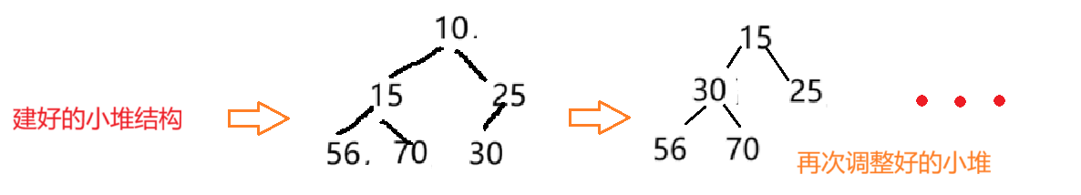 交换完后,堆结构不再是小堆,需要进行向下调整为小堆结构,在次重复调换。