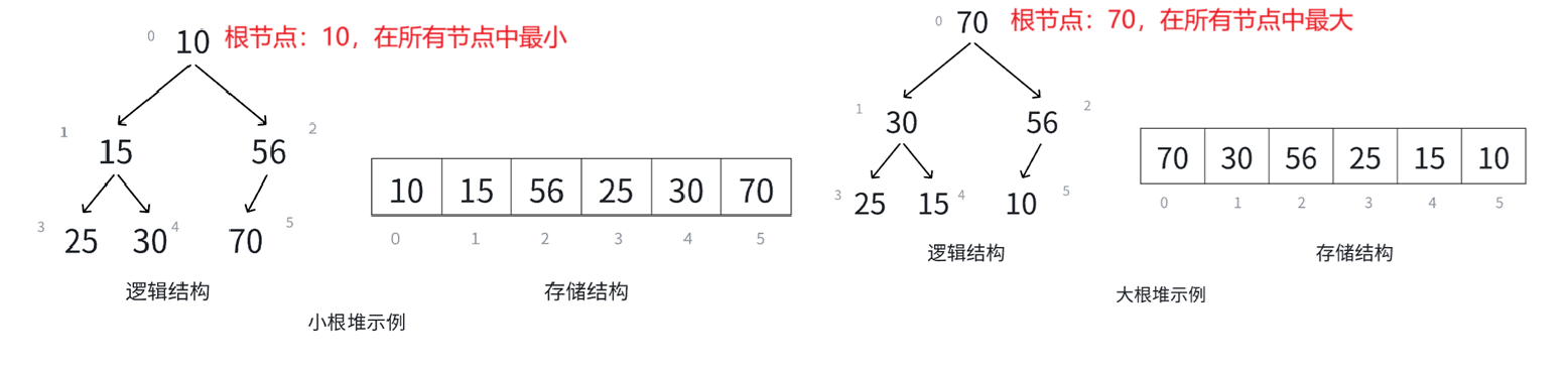 - 小堆:根节点最小的堆,或叫“小根堆”、“最小堆”。