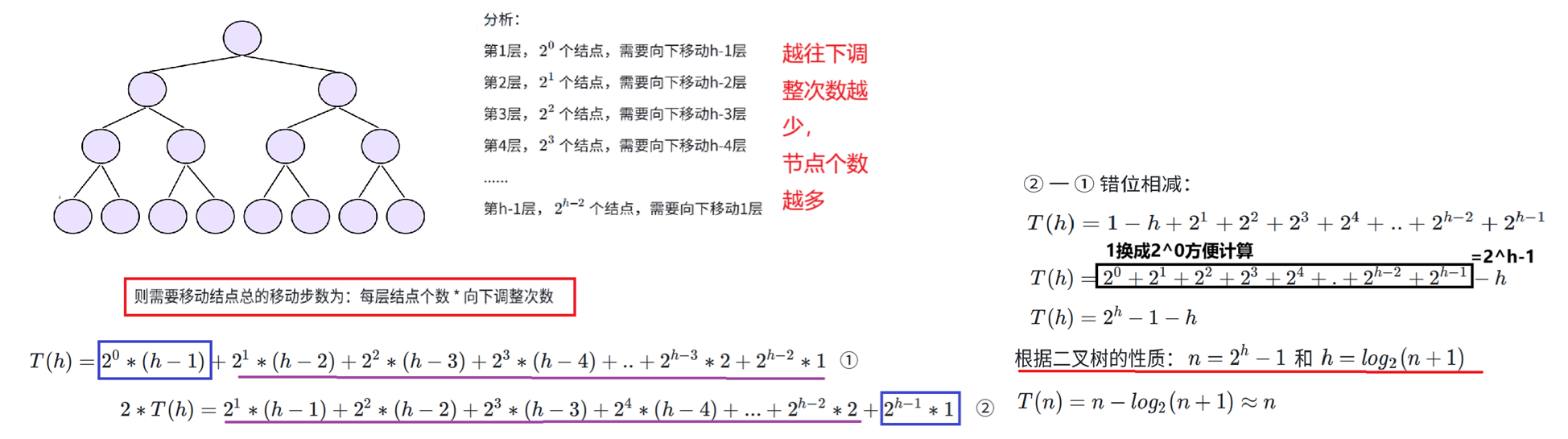 最后根据大O的渐进表示法:向上调整建堆算法时间复杂度 --> O(n*logn),向下调整建堆算法时间复杂度 --> O(n)。