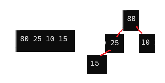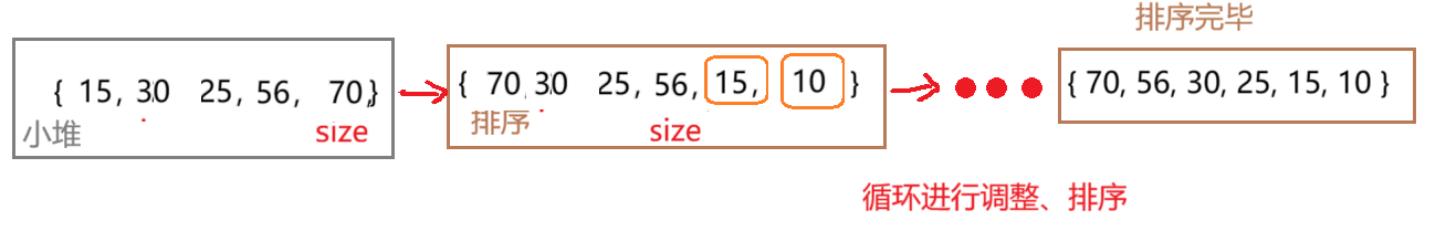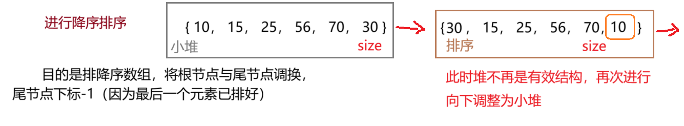 在一开始建完小堆后,就是要进行排降序数组(在数组内部原地操作),具体是-->将根节点数值与尾节点数值交换,完后尾节点下标 size - 1(因为最后一个元素为当前小堆结构的最小数值);