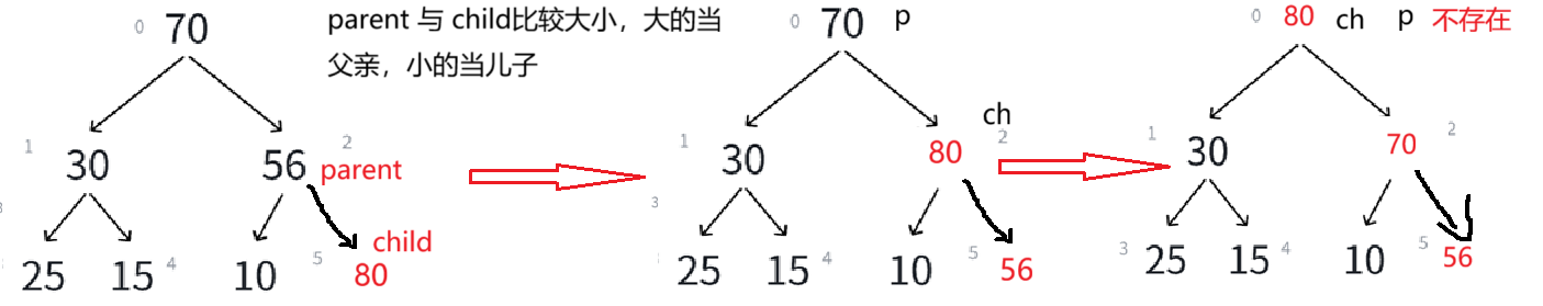 然后parent 与 child 比较大小,交换位置,大的作父节点,小的作子节点;child继续指向插入节点。
