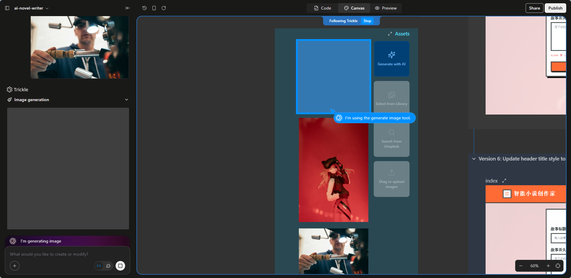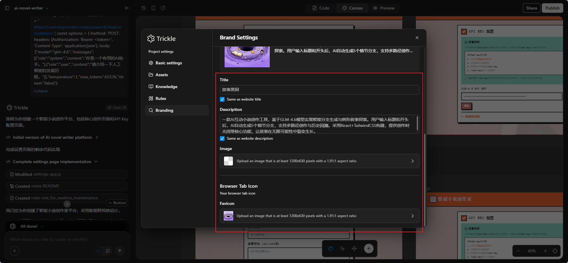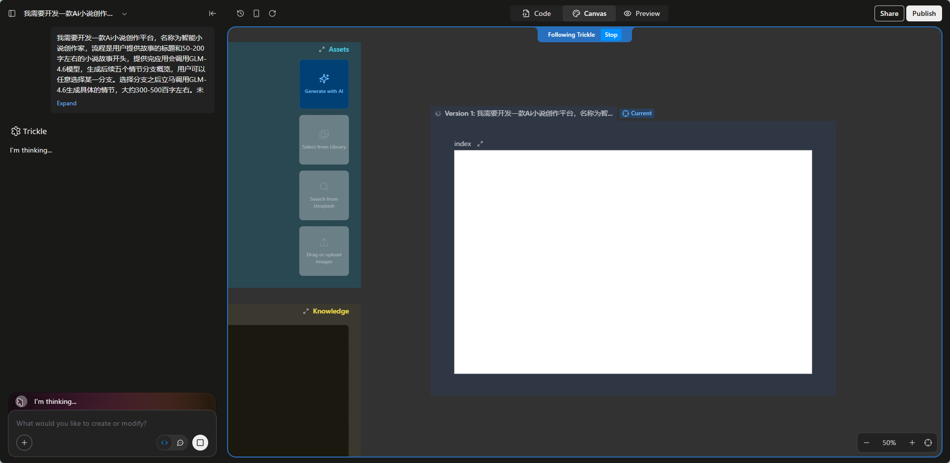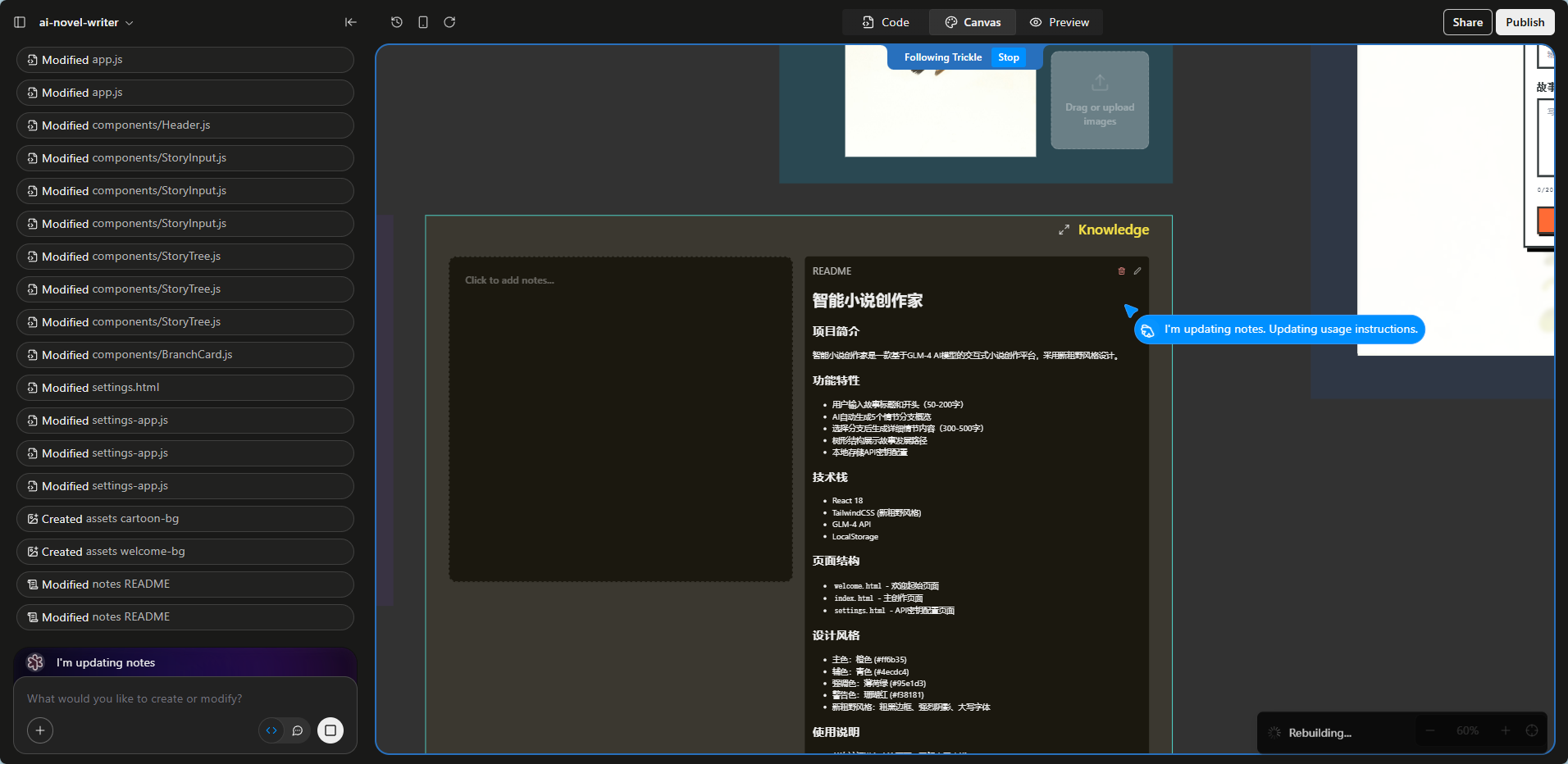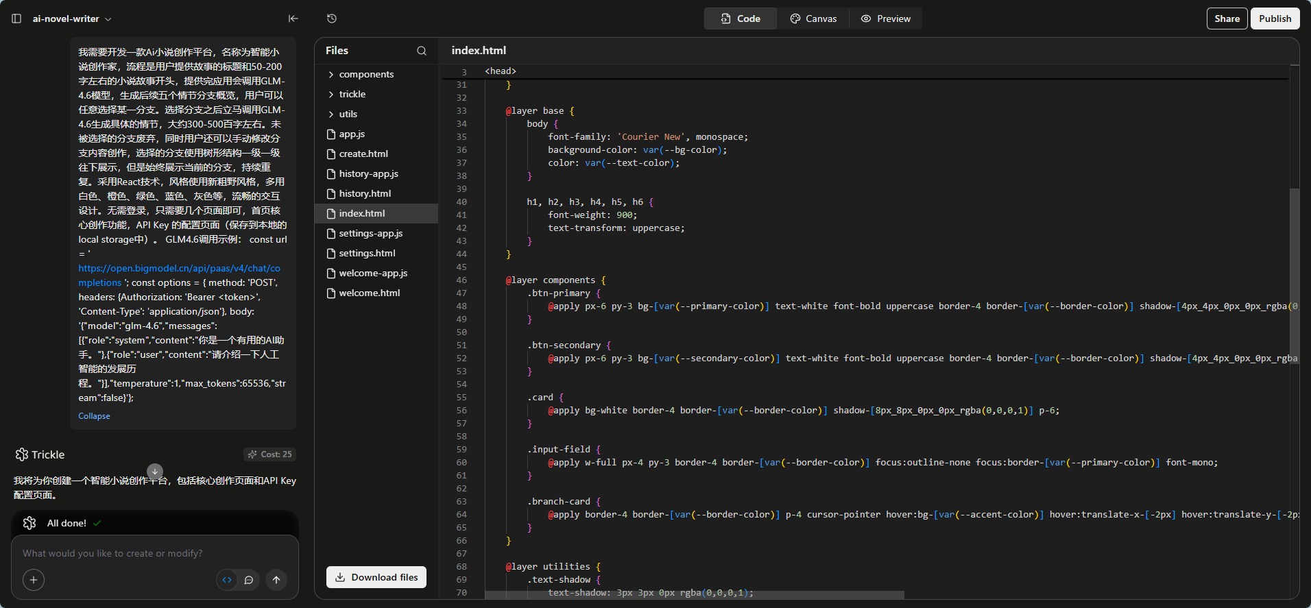 本文将带你从零开始,利用 Trickle Magic Canvas 可视化开发平台,结合 智谱 AI 提供的 GLM-4.6 大模型API,亲手打造一个智能小说生成器。它不仅能根据你的开头智能生成多个精彩故事分支、自定义标题与开头输入、创作历史管理(包括查看、继续创作与一键删除),以及对已生成内容进行局部调整和重新续写,堪称你的私人AI小说创作助手。