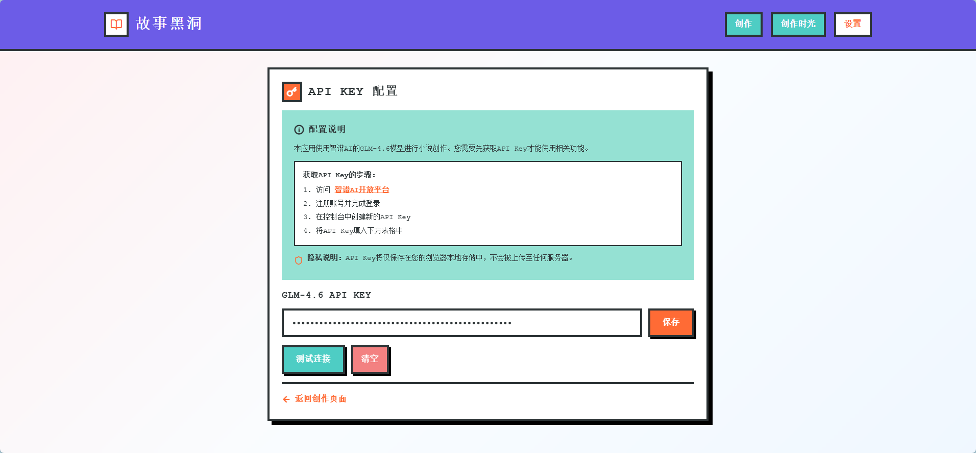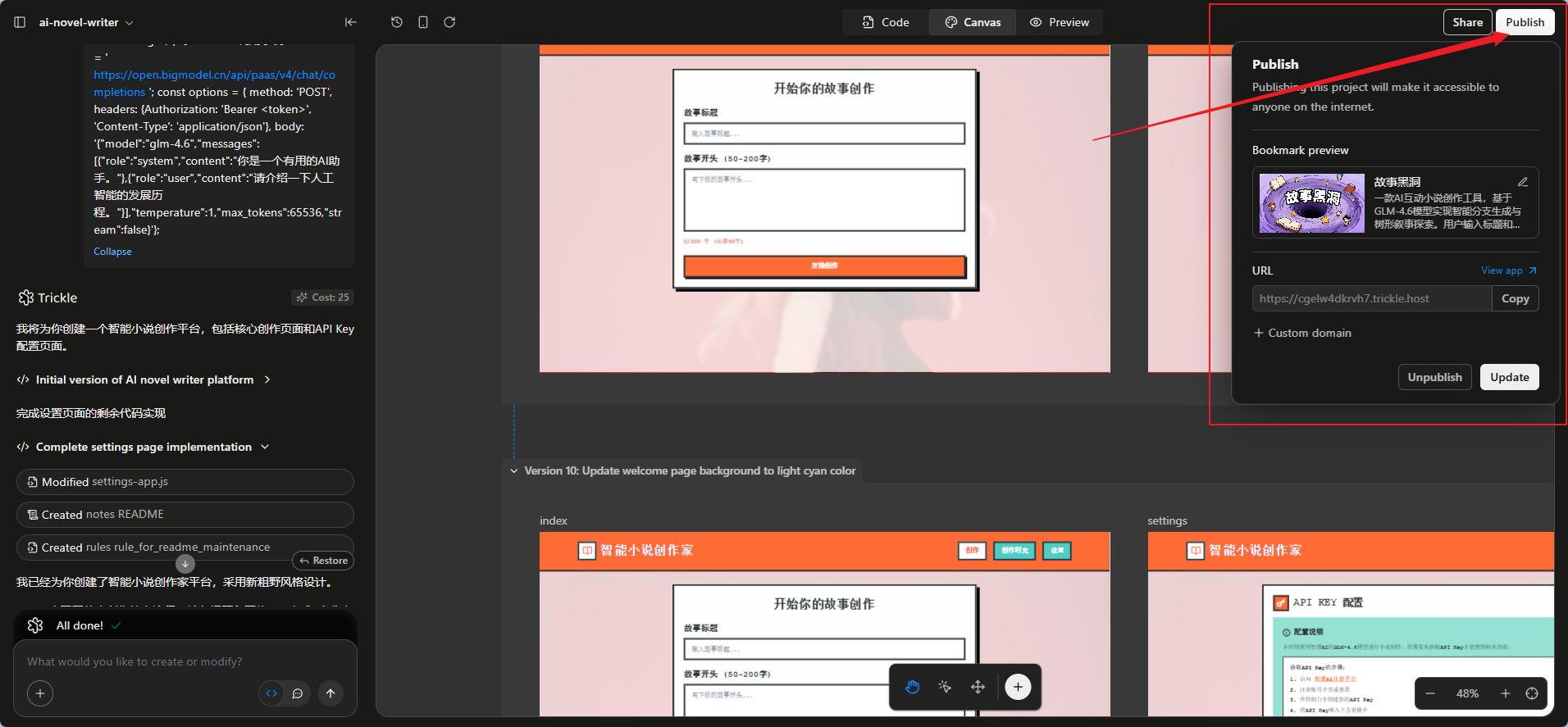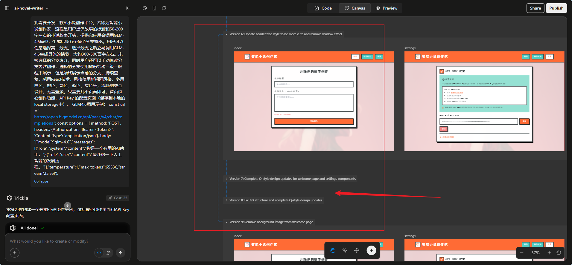 通过整合 Trickle 与 智谱GLM-4.6 API,我构建了一个高效、可扩展的互动小说创作工具原型。该工具不仅验证了流式 LLM 在动态叙事中的可行性,也为内容创作者提供了“AI 协同创作”的新范式。同时我们成功将「AI小说创作」从概念落地为可交互的生产力工具。