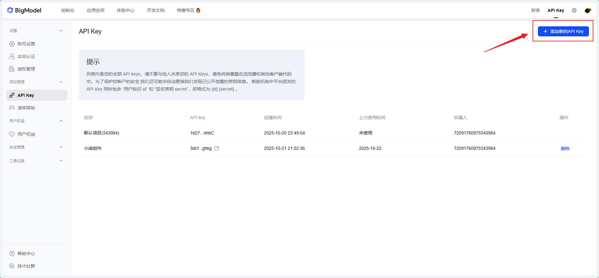 1. 首先先我们去智谱Ai官网注册创建自己的的API Key:智谱API Key创建