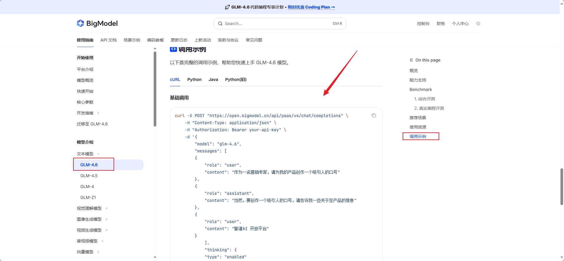 2. 查看智谱GLM-4.6 API开发文档,AI小说创作能力的强弱和使用的模型能力关系非常大。