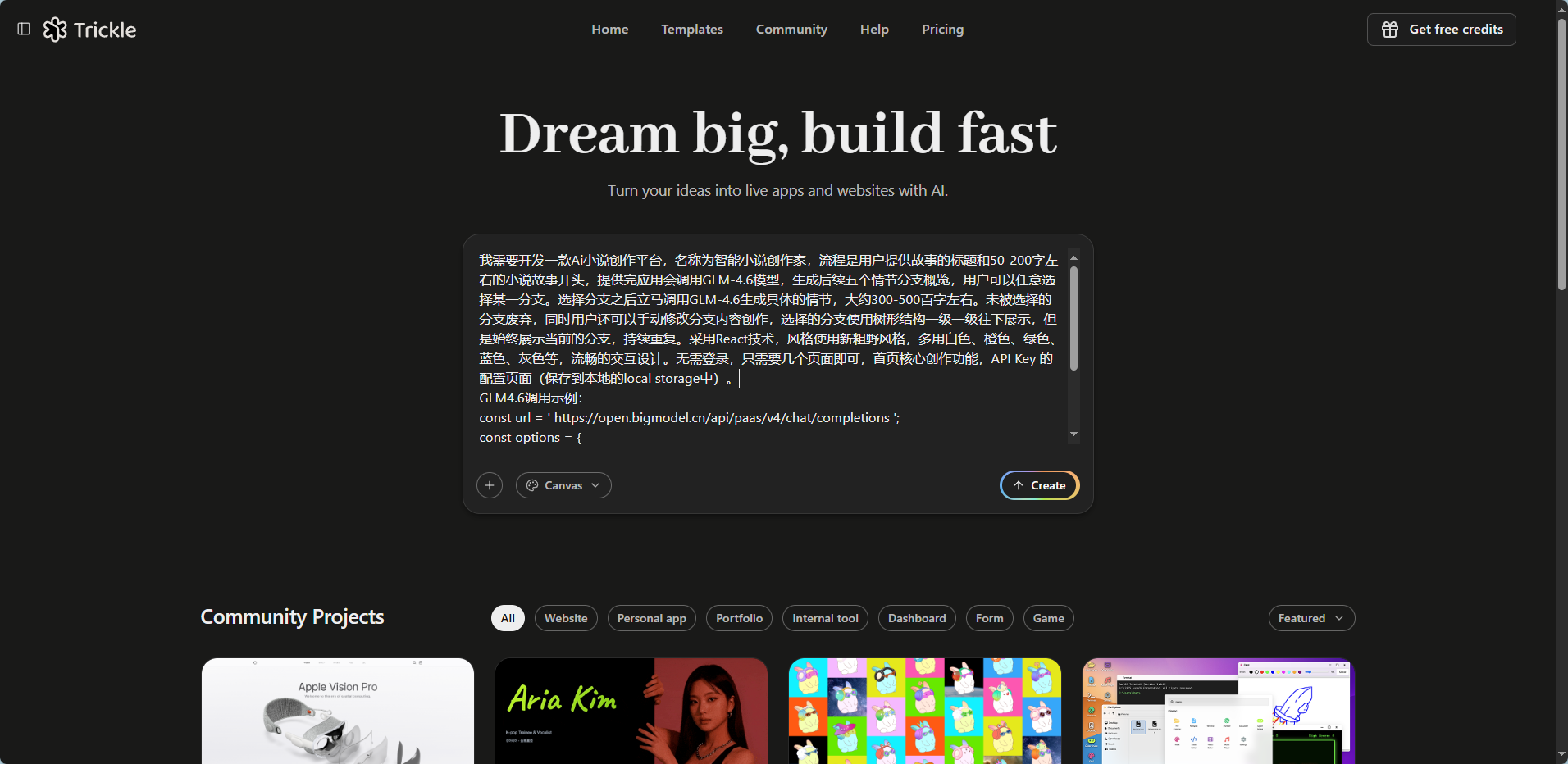 本文围绕如何使用 Trickle 流式处理框架与 GLM-4.6 API 构建一个轻量级但功能完整的互动小说创作工具展开。Trickle是全球首个无缝衔接多模态生成的 Vibe Coding 工具。把多模态生成(图像、视频)和 网站 / App 搭建完全打通,真正实现从灵感到上线的一站式创作;而 GLM-4.6 作为智谱 AI 推出的高性能文本模型,在中文叙事生成、角色一致性与上下文记忆方面表现优异。