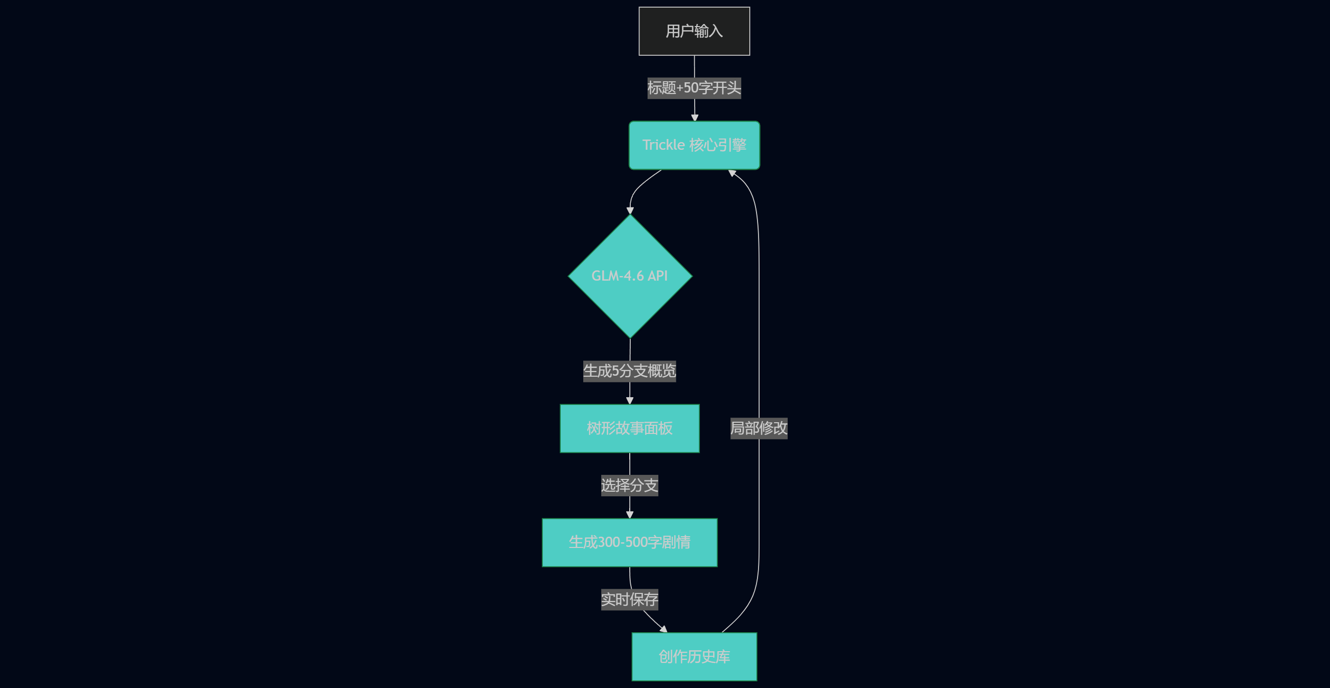 在实际开发中,我深刻体会到:技术选型必须服务于用户体验——Trickle 的规则机制有效防止了实际开发走偏,而 GLM-4.6 的中文叙事能力则大幅提升了剧情质量。未来,该工具可进一步集成语音输入、多角色对话记忆、剧情质量评估(如一致性检测)等功能。