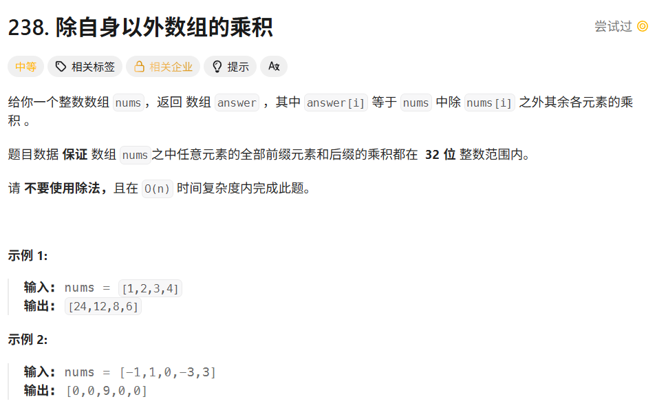 class Solution {public int[] productExceptSelf(int[] nums) {int n=nums.length;int[]l=new int[n];int[]r=new int[n];int[]result=new int[n];l[0]=1;r[n-1]=1;int i=1;int j=n-2;while(i<n){l[i]=l[i-1]*nums[i-1];i++;}while(j>=0){r[j]=r[j+1]*nums[j+1];j--;}for(int p=0;p<n;p++){result[p]=l[p]*r[p];}return result;}