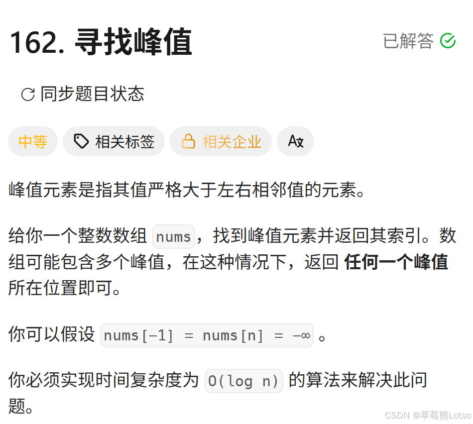 结语:本文通过两道力扣算法题(852、162)讲解二分查找在寻找数组峰值中的应用。以题带点,详细分析了山峰数组的特性:峰顶同时大于左右相邻值,左侧呈上升趋势,右侧呈下降趋势。解题时抓住"二段性"特征,通过比较中间值与相邻元素的关系,逐步缩小搜索范围。