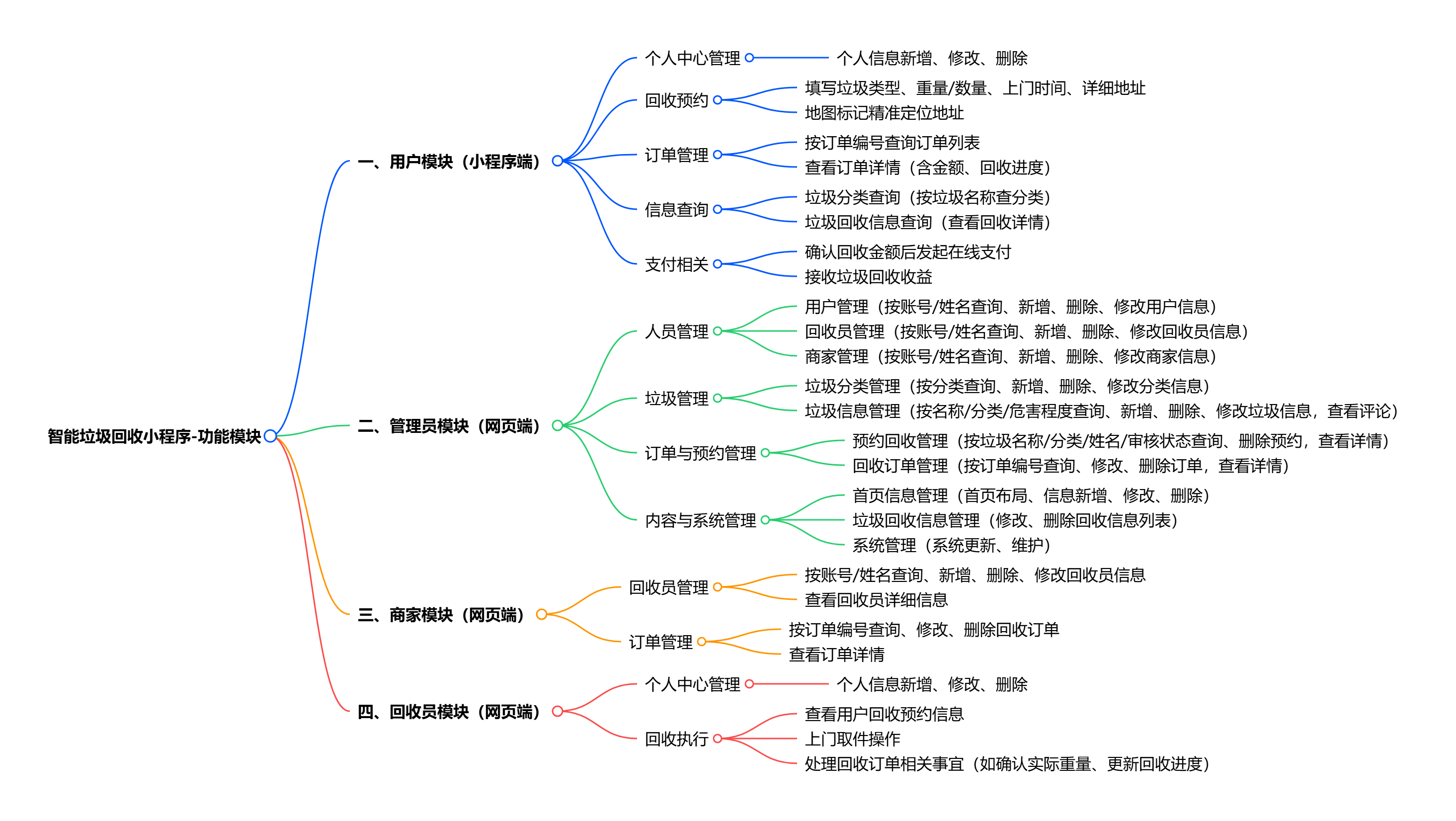 系统面向居民、回收员、商家和管理员四类角色,核心功能包括:在线预约回收、地图定位、垃圾分类查询、订单支付与追踪、上门取件调度以及后台数据审核。