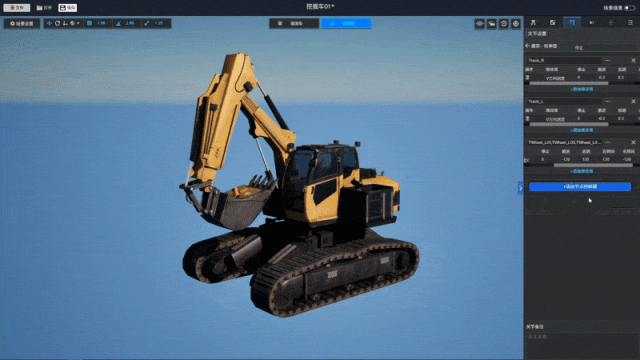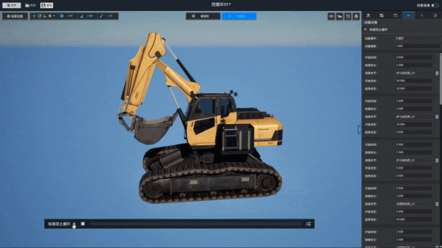 在挖掘机案例中,我们制作了“标准挖土循环”动画,完整模拟工程作业中的“挖掘-转运-倾倒”流程。通过动画编辑,挖掘机模型不再是孤立的部件组合,而是能模拟真实作业逻辑的“数字设备”,可直接用于工程培训、作业流程仿真等场景。