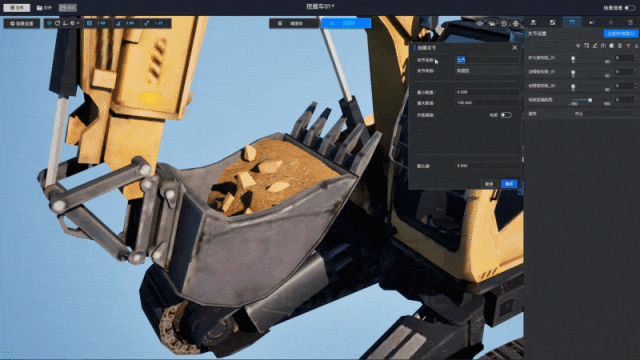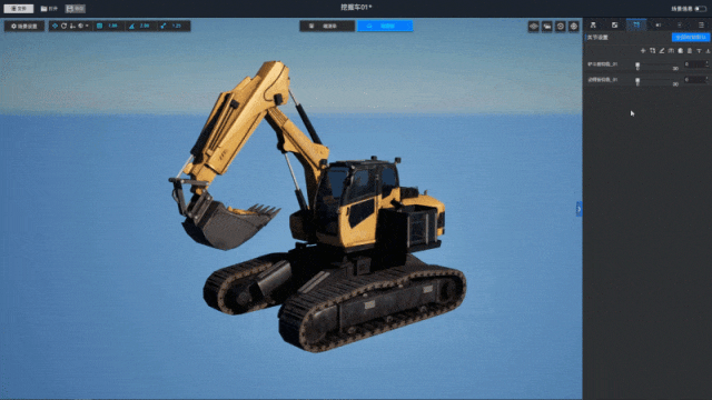 通过以上关节配置,挖掘机模型已具备“数据驱动的动态控制能力”——外部系统只需传入简单的数值、枚举或布尔参数,即可让模型完成“动作执行-状态切换-效果展示”的全流程响应。