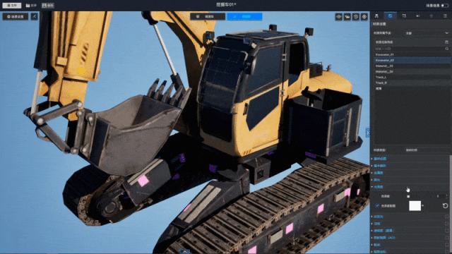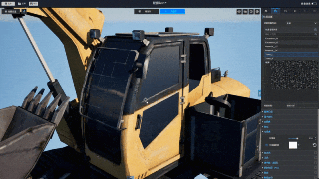 “好看”是数字孪生模型的基础要求,而“真实”则是提升可信度的关键。图观模型编辑器的 PBR 材质系统,让挖掘机的“金属外壳、玻璃驾驶室、橡胶履带”等部件呈现出符合物理规律的视觉效果。