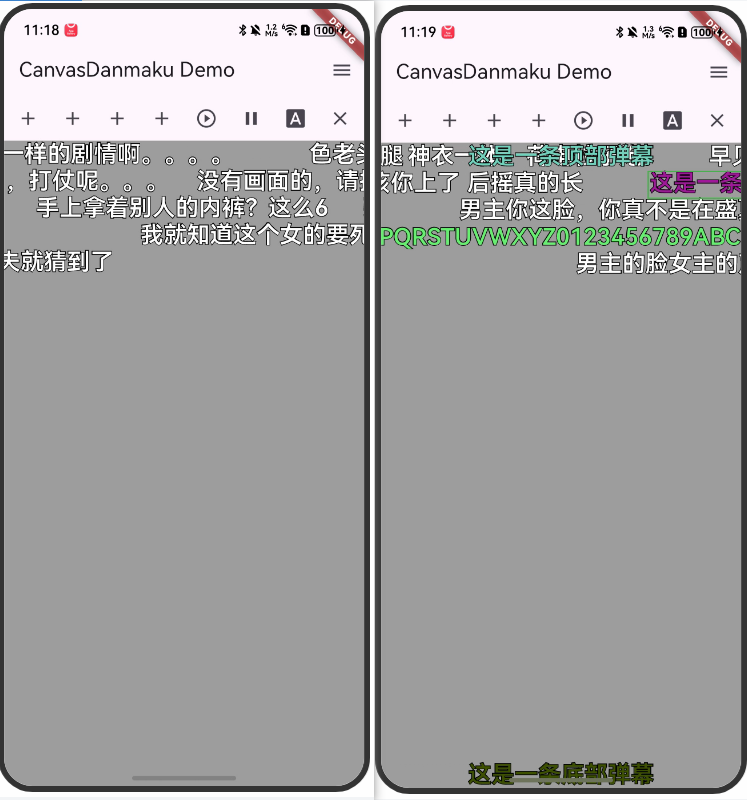 - **自定义绘制**:使用`CustomPaint`直接操作Canvas,替代传统`Widget`树渲染,减少布局计算和Widget重建开销,适合高并发弹幕场景。