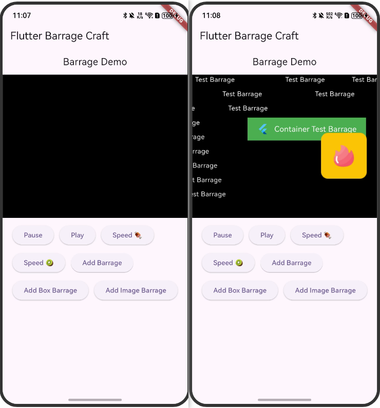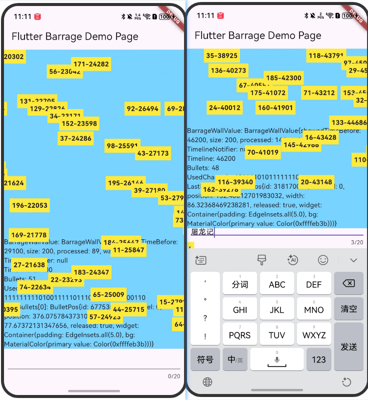 实时位置跟踪:通过BarrageItemPosition记录弹幕的动画值、宽度等,AnimatedBuilder实时更新位置: