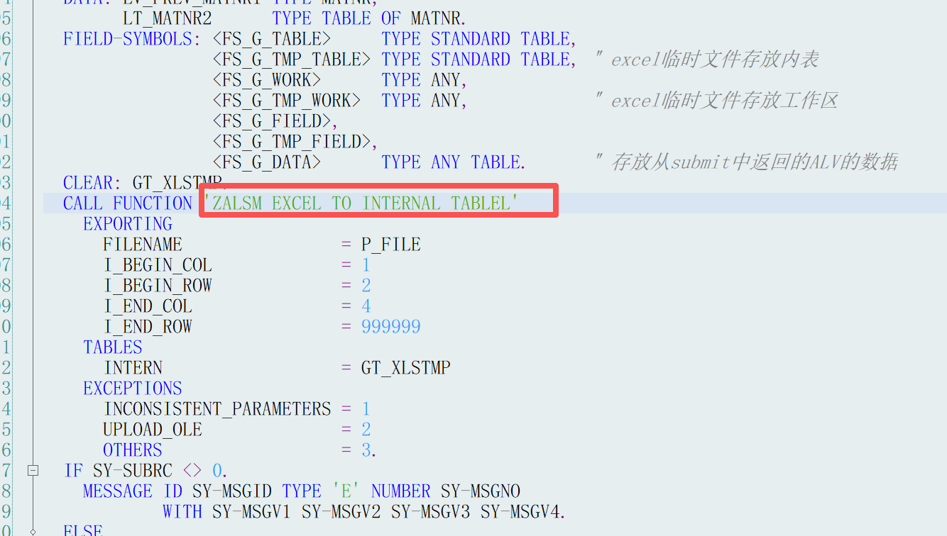FORM FRM_UPLOAD_FILE_LONG .DATA: GT_XLSTMP TYPE ZALSMEX_TABLINE_LONG OCCURS 0 WITH HEADER LINE,CL_EXCEPTION TYPE REF TO CX_ROOT.DATA: GV_OKCODE LIKE SY-UCOMM,GV_INDEX TYPE I,GV_TABIX TYPE I.DATA: LV_PREV_MATNR1 TYPE MATNR,LT_MATNR2 TYPE TABLE OF MATNR.FIELD-SYMBOLS: <FS_G_TABLE> TYPE STANDARD TABLE,<FS_G_TMP_TABLE> TYPE STANDARD TABLE, " excel临时文件存放内表<FS_G_WORK> TYPE ANY,<FS_G_TMP_WORK> TYPE ANY, " excel临时文件存放工作区<FS_G_FIELD>,<FS_G_TMP_FIELD>,<FS_G_DATA> TYPE ANY TABLE. " 存放从submit中返回的ALV的数据CLEAR: GT_XLSTMP.CALL FUNCTION 'ZALSM_EXCEL_TO_INTERNAL_TABLEL'EXPORTINGFILENAME = P_FILEI_BEGIN_COL = 1"从第1列开始读取EXCELI_BEGIN_ROW = 2"从第二行开始读取EXCELI_END_COL = 4"读EXCEL到第四列结束I_END_ROW = 999999"最多读取999999行EXCEL数据TABLESINTERN = GT_XLSTMPEXCEPTIONSINCONSISTENT_PARAMETERS = 1UPLOAD_OLE = 2OTHERS = 3.IF SY-SUBRC <> 0.MESSAGE ID SY-MSGID TYPE 'E' NUMBER SY-MSGNOWITH SY-MSGV1 SY-MSGV2 SY-MSGV3 SY-MSGV4.ELSE.* 将数据转换成自建表的数据格式SORT GT_XLSTMP BY ROW COL.TRY .LOOP AT GT_XLSTMP.CLEAR: GV_INDEX.MOVE GT_XLSTMP-COL TO GV_INDEX.UNASSIGN <FS_G_FIELD>.ASSIGN COMPONENT GV_INDEX OF STRUCTURE GS_EXCEL TO <FS_G_FIELD>.IF SY-SUBRC = 0.MOVE GT_XLSTMP-VALUE TO <FS_G_FIELD>.AT END OF ROW.APPEND GS_EXCEL TO GT_EXCEL.CLEAR: GS_EXCEL.ENDAT.ELSE.MESSAGE '数据格式异常,请检查!' TYPE 'S' DISPLAY LIKE 'E'.LEAVE LIST-PROCESSING.ENDIF.ENDLOOP.CATCH CX_ROOT INTO CL_EXCEPTION. " 捕获数据格式错误异常MESSAGE '数据格式异常,请检查!' TYPE 'S' DISPLAY LIKE 'E'.LEAVE LIST-PROCESSING.ENDTRY.ENDIF.
