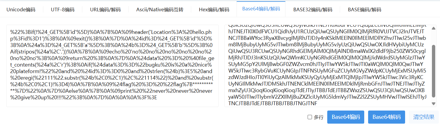 注释的代码看起来像是base64加密的,尝试用在线base64解码,解码出来一堆%的字符串。
