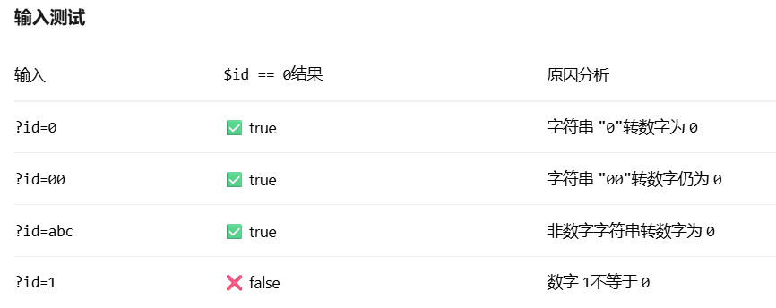 我们需要找到:id的值是true,但是等于0的。==是弱类型比较,比较时会进行类型转换。