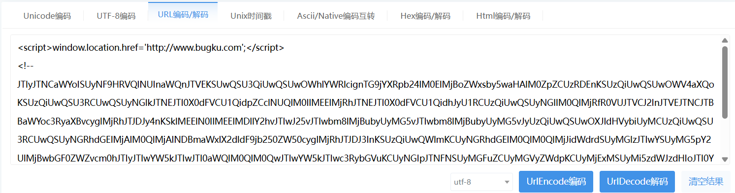 通过在线url解码,发现他是链接到了bugku的页面(怪不得跳转到了bugku)。下面还有一段注释代码,拷贝出来。